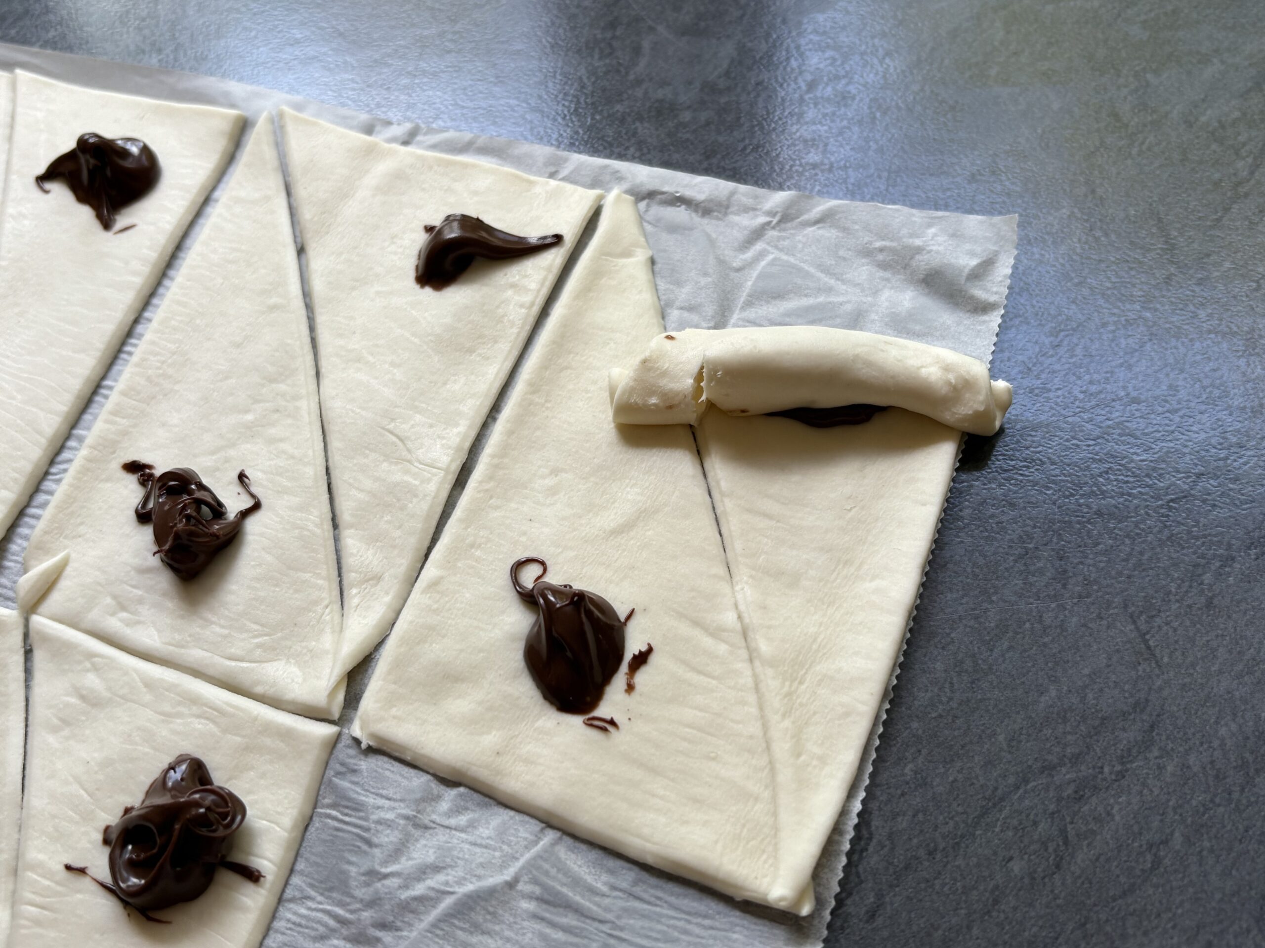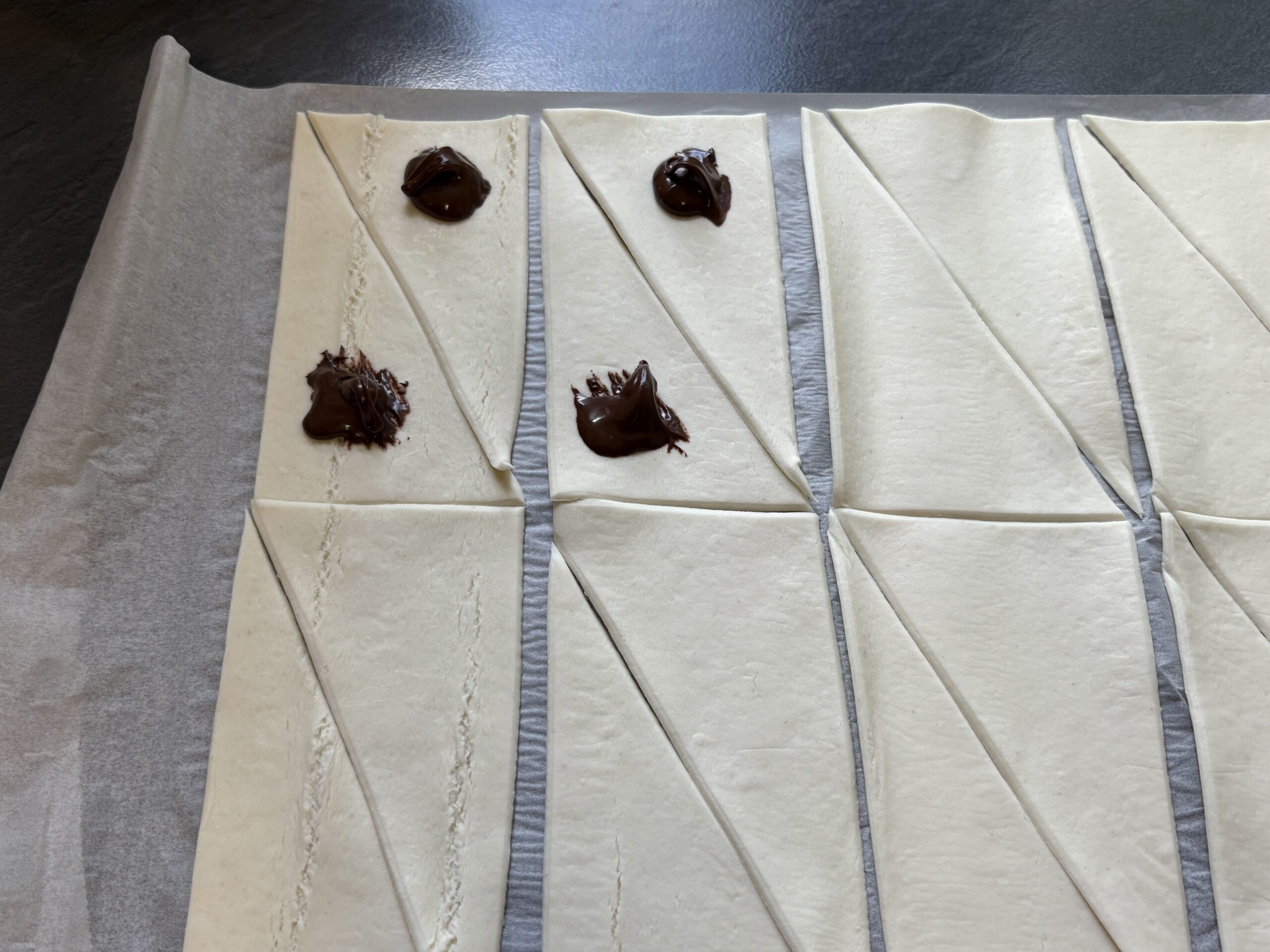 Jede Hälfte wird in 3 Teile geschnitten. Die einzelnen Streifen werden danach noch einmal mittig geteilt. Zum Schluss von Kante zu Kante jedes einzelne Stück schräg durchschneiden, sodass ein Dreieck entsteht. - Auf die breite Seite der Dreiecke etwas Nuss-Nougat-Creme geben (ca. 1/2 TL).