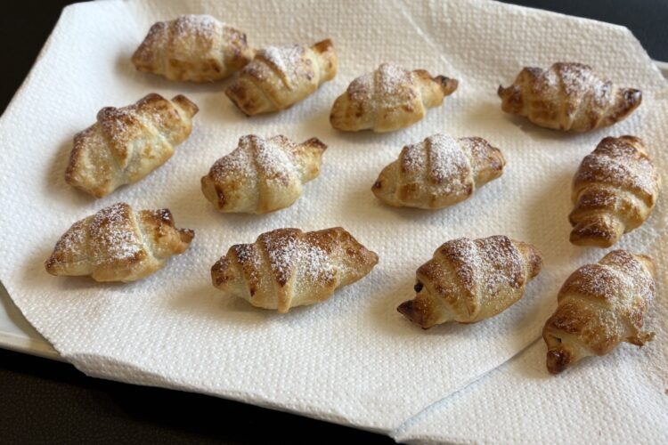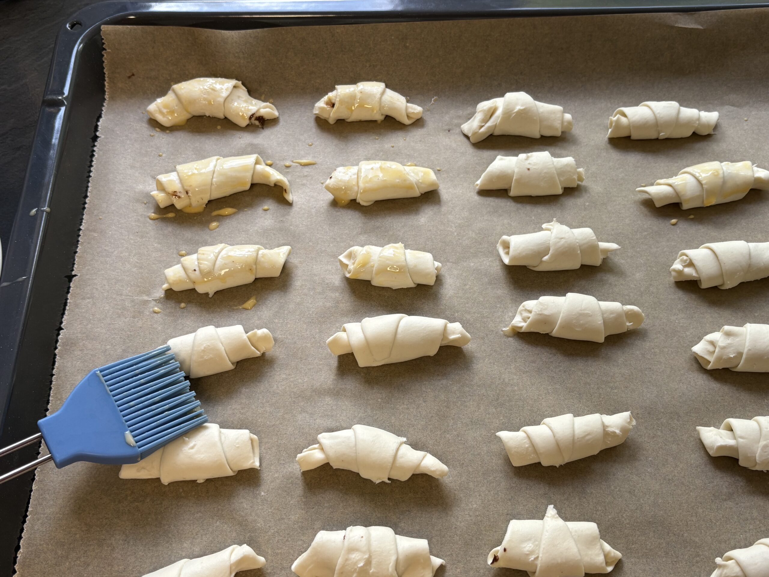 - Eigelb und Milch mischen und die Croissants mit dem Gemisch bestreichen.